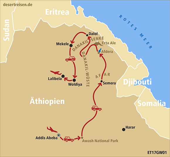 Flug von Frankfurt am Main nach Addis Abeba; Fahrt mit Geländewagen in den für seine Flora und Fauna bekannten Awash-Nationalpark; Begegnungen mit Stämmen der Afar-Nomaden; Aufstieg zum Naturwunder: dem Vulkan Erta Ale; Eintauchen in die Danakil-Wüste, die mit ihrer Kargheit und Wildheit eine der extremsten Landschaften unserer Erde ist; Salinen, Vulkane und unterirdische Quellen; Begegnung mit Salzkarawanen; Besuch der Salinen von Dalol; Fahrt ins äthiopische Hochland über die Stadt Mekele mit ihren Felsenkirchen zur christlich geprägten Stadt Lalibela mit Besichtigung der dortigen Kirchen; Inlandflug von Lalibela nach Addis Abeba; Rückflug nach Frankfurt am Main.