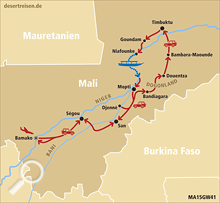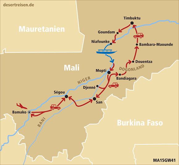 Flug von Frankfurt über Casablanca nach Bamako; mehrtägiger Aufenthalt mit Wanderungen im Dogonland; Fahrt von Douentza zu den Hombori-Bergen; 2-tägige Pinassenfahrt auf dem Niger; Streifzug durch die Flusshafenstadt Mopti; die berühmte unter UNESCO-Schutz stehende Lehmmoschee von Djenné aus dem 13. Jahrhundert; Erkundung von Malis Hauptstadt Bamako; Rückflug von Bamako über Casablanca nach Frankfurt.