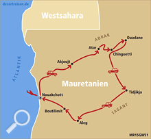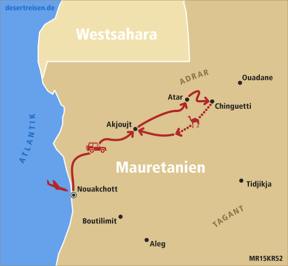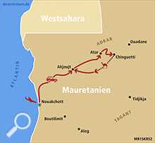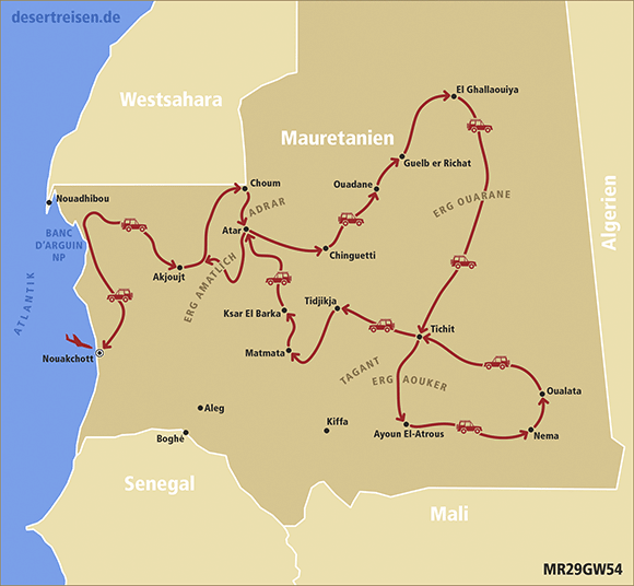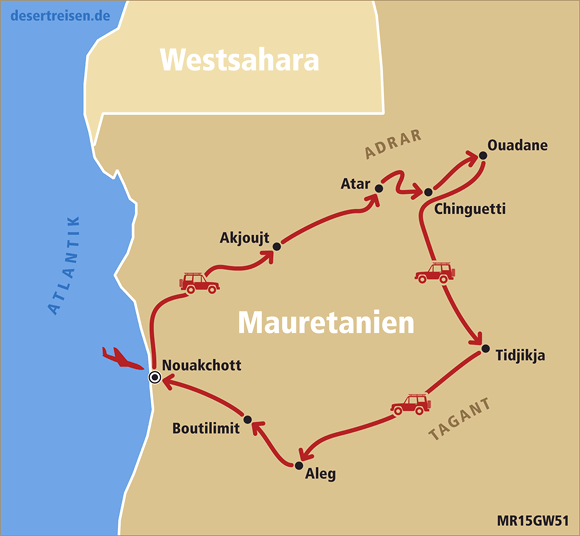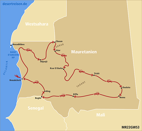 Flug von Frankfurt am Main über Casablanca nach Nouakchott, der Hauptstadt Mauretaniens; Fahrt nach Norden in Richtung des als Weltnaturerbe unter UNESCO-Schutz stehenden Nationalparks Banc d’Arguin an der Atlantikküste; nach einem Stopp am Atlantik Fahrt über Akjoujt nach Choum; Treffen mit dem Eisenerzzug, dem sogenannten „Zug der Wüste“; über Azougui und Atar zur unter UNESCO-Schutz als Weltkulturerbe stehenden historischen Wüstenstadt Chinguetti; Wüstenfahrt zur alten ebenfalls unter UNESCO-Schutz stehenden Oase Ouadane; Weiter über den Krater Guelb er Richat - das Auge Afrikas - bis El Ghallaouiya; mehrtätige Durchquerung des Erg Ouarane mit einsamen Dünenkämmen bis zur unter UNESCO-Schutz stehenden historischen Oase Tichit; über die Straße der Salzkarawanen durch Erg Aouker bis Ayoun El-Atrous; Weiterfahrt über Nema zur unter UNESCO-Schutz stehenden legendären Wüstenoase Oualata; von dort aus durch die Wüste über Tichit bis zur Stadt Tidjikja; über die Wasserbecken von Matmata mit den Wüstenkrokodilen bis zu den Ruinen von Kaser El Barka mitten in der Wüste; wie gelangen durch die Wüste zu den Dünen von Bouaboune; durch Gebirge und mehrere Wadis zu den Dünen von Maadan; Fahrt durch das Adrar-Gebirge über kleine Ortschaften, Wadis und Tafelberge bis zur Schlucht von Tezent; durch Wadi Labiad und über die Ortschaft Maddah bis zu den hohen Dünen vom Erg Amatlich; Durchquerung des Erg Amatlich; über Azweiga und die Stadt Akjoujt zurück nach Nouakchott; Rückflug von Nouakchott über Casablanca nach Frankfurt am Main.