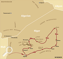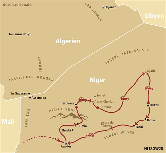 Flug von Frankfurt am Main über Niamey nach Agadez; Fahrt mit Geländewagen ins Aïr-Gebirge zu den Tuareg-Oasen Timia und Iferouane; Begegnung mit Tuareg-Nomaden in der Wüste; über die Blauen Berge zu den schönen Dünen von Adrar Cheriet; Weiterfahrt durch das Aïr-Gebirge nach Arakao, der sogenannten „Krabbenschere“; über Adrar Medet nach Chirfa und Djado im Djado-Plateau; Durchquerung der Wüste von Djado bis zu den berühmten Salzoasen Bilma und Fachi; Besuch des Salzabbaus; Fahrt durch die Ténéré-Wüste zum legendären Arbre du Ténéré; mit etwas Glück sind auf dieser Strecke heute noch Salzkarawanen anzutreffen; Weiterfahrt nach Süden über die Falaise Tiguidit nach Agadez; Rückflug von Agadez über Niamey nach Frankfurt am Main.