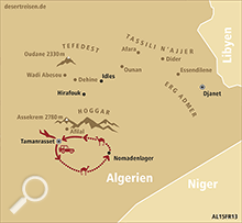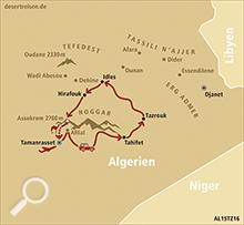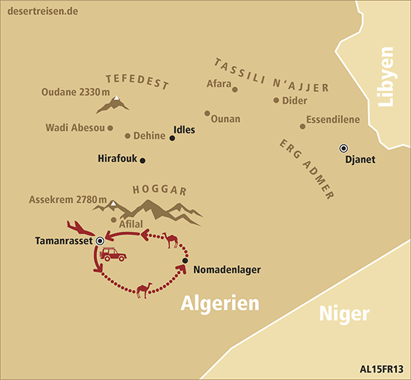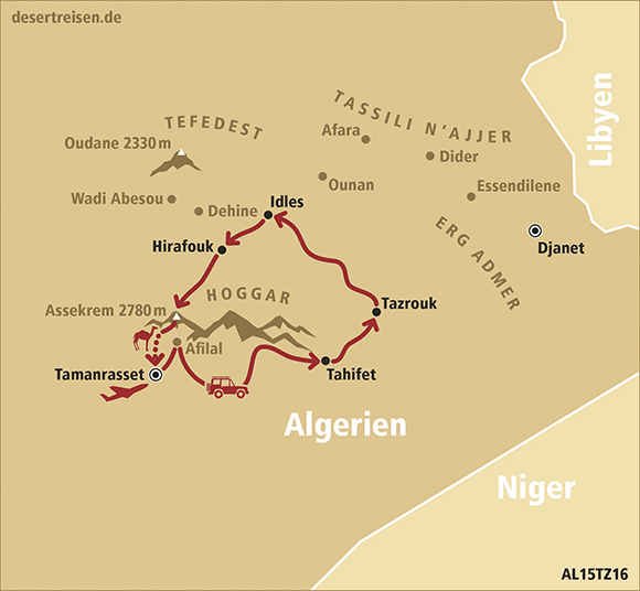 Flug von Frankfurt am Main über Algier nach Tamanrasset; mit Geländewagen Ausflug zu den Wasserquellen von Afilal im Hoggar-Gebirge; über Tahifet zur Oase Tazrouk; Teilnahme am 2-tägigen Tuareg-Fest; Eintauchen in das bunte Spektakel der von überall her angereisten Tuareg; Kamelrennen und traditionelle Tänze zur Musik der Tuareg; über die Bergoase Idelès und Hirafouk; Begegnung mit den dort lebenden Menschen; Fahrt über den „Sandalenpass“ (Tehe n’Taratemt) zum berühmten Berg Assekrem; einmaliger Sonnenunter- und Sonnenaufgang auf dem Gipfel; 2 -tägiges Kameltrekking bei Ilamane südlich des Assekrem; unvergessliche Nächte unter dem unendlichen Wüstenhimmel; Stadtbummel durch Tamanrasset; Rückflug von Tamanrasset über Algier nach Frankfurt.