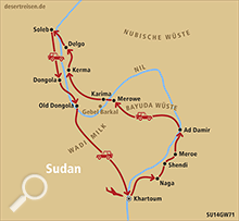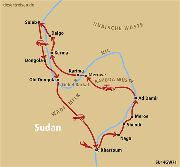 Flug von Frankfurt am Main nach Khartoum; Besichtigung von Khartoum; Fahrt nach Norden zum antiken Kulturzentrum von Naga; Weiterfahrt über die Tempelanlage von Musawarat as-Sufra zu den berühmten Pyramiden von Meroe; Nilüberquerung bei Ad Damir; Durchquerung der Bayuda-Wüste bis zur Stadt Karima; Besuch des heiligen Gebel Barkal; Besichtigung des großen Amuntempels von Napata; Durchquerung der Wüste von el Nekheila bis nach Kerma, der Hauptstadt des nubisches Reiches im 3. Jahrtausend v. Chr.; Fahrt über idyllische nubische Dörfer am Nil bis zu den Tempelanlagen von Sesebi und Soleb; Fahrt durch die Wüste entlang der legendären alten Darb el-Arbain „Straße der vierzig Tage“; Weiterfahrt über Tumbus zu der einst christlichen und später islamischen Hauptstadt Nubiens: Alt Dongola; Rückfahrt nach Khartoum und Besuch des Basars von Omdurman; Rückflug nach Frankfurt am Main.
