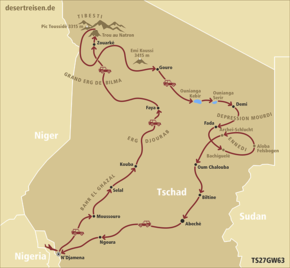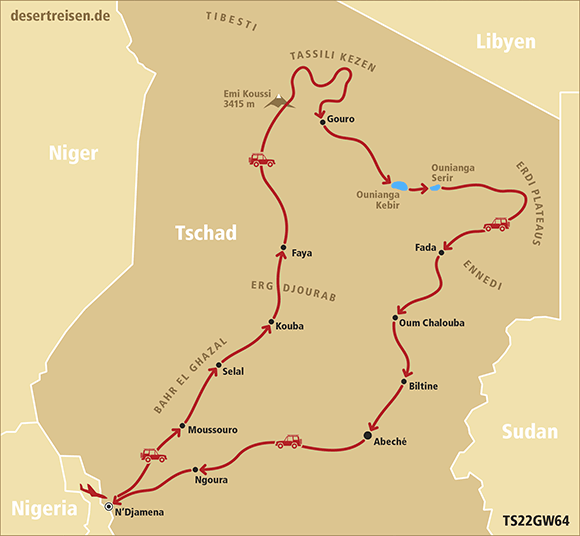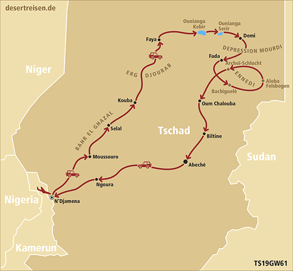 Flug von Frankfurt am Main über Addis Abeba nach N'Djamena. Durch Sahellandschaft den Gazellenfluss entlang durch die Dünen des Erg Djourab bis Faya. Weiterfahrt vorbei am höchsten Berg des Tschad, dem Emi Koussi, in die phantastische Tassili-Landschaft von Kezen im südlichen Tibesti, wo inmitten wunderschöner Sandsteinformationen umgeben von verschiedenfarbigem Sand Zeit zum Verweilen bleibt. Über das Tubu-Dorf Gouro zu den Ounianga-Seen. Weiterfahrt in die unbekannte Gegend der Erdis nördlich des Ennedis. Entdeckung dieser bizarren und nahezu unbekannten kargen und sandigen Felsplateaus. Über die Tassili-Landschaft von Chebi und Fada und das westliche Ennedi nach Oum Chalouba. Über die Städte Biltine, Abeché und Mongo zurück nach N’Djamena. Rückflug über Addis Abeba nach Frankfurt am Main.