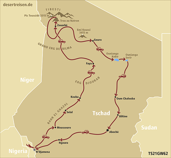 Flug von Frankfurt am Main über Addis Abeba nach N’Djamena; durch Sahellandschaft den Gazellenfluss entlang und durch die hellen Dünen des Erg Djourab bis Faya; in nordwestlicher Richtung reisen wir durch Felsen- und Sandlandschaften; über weite Ebenen und vorbei am markanten Felsen Ehi Atron in die Dünen des Erg Bilma; durch Wadi Yao und die schöne Tassili-Landschaft Marmar zum Ort Zouarké nahe Zouar am Fuße des Tibesti-Gebirges; Fahrt ins Tibesti-Gebirge zu einem der Höhepunkte dieser Reise zum Vulkankrater „Trou au Natron“; dann wieder bergab zurück nach Zouarké über Enneri Maro und Enneri Ké in eine bizarre Felsenlandschaft von hohen Türmen, Wadis und Felsbildern, vielleicht Begegnung mit Tubu-Nomaden und ihren Tieren; Weiterfahrt südlich vom höchsten Berg des Tschads Emi Koussi (3.415 m) bis zum schön gelegenen Tubu-Dorf Gouro mit seinen zahlreichen Palmen; von Gouro zu den als Weltnaturerbe unter UNESCO-Schutz stehenden Ounianga-Seen; von der Mourdi-Depression geht es über Bischagara vorbei an den westlichen Ausläufern des Ennedi; über Oum Chalouba und Biltine bis Abeché und vorbei an mehreren Dörfern mit bunten afrikanischen Märkten zurück nach N’Djamena; Rückflug über Addis Abeba nach Frankfurt am Main.