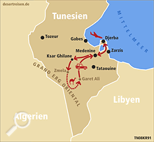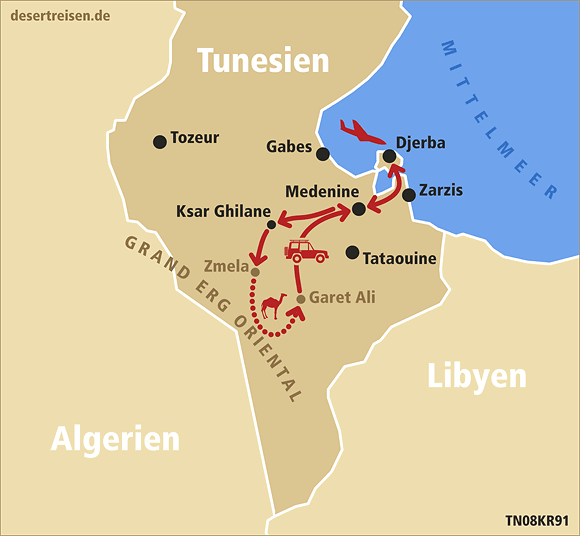 Flug von Frankfurt am Main nach Djerba; Transfer zum Hotel; Fahrt zum Treffpunkt mit den Kamelen südlich von Ksar Ghilane; 5-tägiger Kamelritt durch die Dünenlandschaft des Erg Oriental beginnend in Zmela über Zemlet Lebiout, Zmela el Bidha, Gouaret el Hab und Houdha el Aghnem bis Garet Ali; Lagerleben mit Lagefeuer unter dem Sternenhimmel der Wüste; nach erlebnisreichen Tagen mit den Kamelen Rückfahrt nach Djerba und Rückflug nach Frankfurt am Main.
