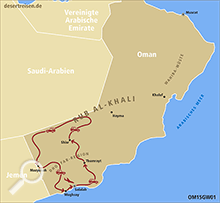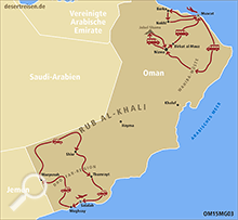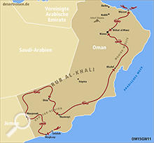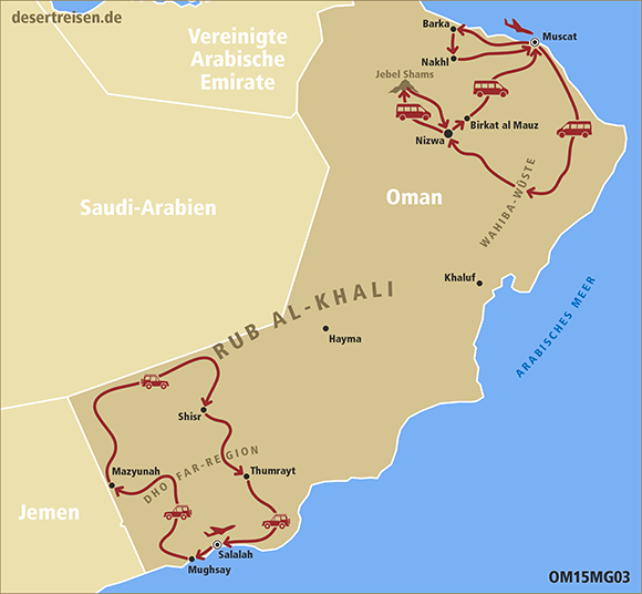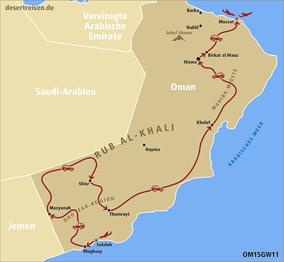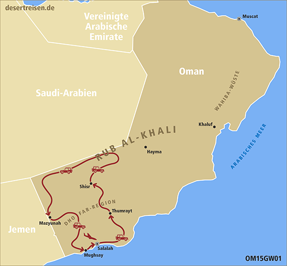 Flug von Frankfurt am Main nach Muscat; Bummel durch die Hauptstadt Omans; Fahrt in die Wahiba-Sandwüste in der Sharqiyah Region; Weiterfahrt über Ibra und Tanuf nach Nizwa; Ausflug nach Jebel Shams und weiter über Birkat al Mauz nach Muscat; Inlandsflug nach Salalah im Süden des Landes; Fahrt mit Geländewagen in die Rub al-Khali Wüste; 4-tägige Fahrt durch das Leere Viertel mit seinen faszinierenden Dünen; Rückfahrt über die historische Stadt Shisr über Mirbat und die Ostküste nach Salalah; Bummel durch Salalah mit seinen orientalischen Geschäften und Märkten; Rückflug von Salalah über Muscat nach Frankfurt am Main.