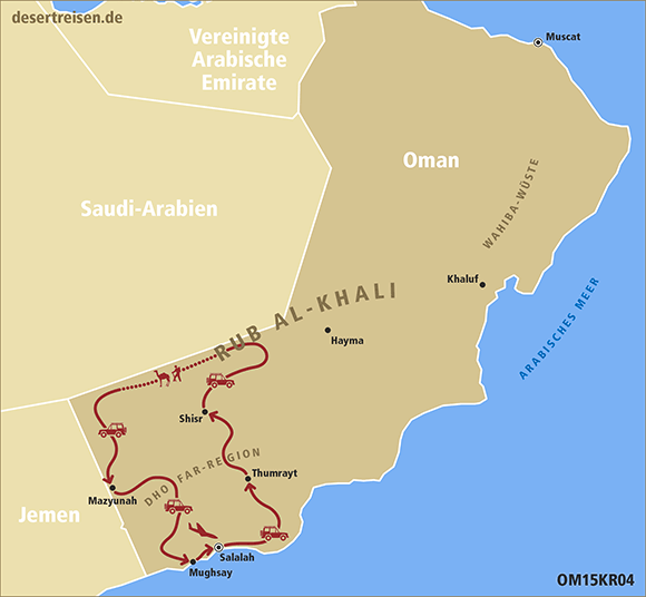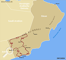 Flug von Frankfurt am Main nach Muscat; Bummel durch die Hauptstadt Omans; Weiterflug nach Salalah, der Hauptstadt der Dhofar-Region; Transfer in die Sandwüste des leeren Viertels „Rub al-Khali“; 7-tägiges Kameltrekking in der Rub al-Khali; intensives Erlebnis der Wüste mit Beduinen; viel Zeit zum Erleben und Genießen; kurze Reit- und Wanderetappen in einem Sandmeer aus faszinierenden Dünen; unvergessliche Sonnenuntergänge; Abende am Lagerfeuer und unter dem Sternenhimmel; Rückfahrt über die Stadt Mazyunah an der jemenitischen Grenze, das Jabal al-Qamar (Mond-Gebirge) und die Westküste nach Salalah; Bummel durch Salalah; Rückflug von Salalah über Muscat nach Frankfurt am Main.