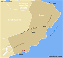 Leistungen: Linienflüge mit Oman Air oder anderen Linienfluggesellschaften ab/bis Frankfurt am Main, Inland-Flüge Muscat-Salalah-Muscat, alle Transfers im Zielgebiet, 5 Übernachtungen in landestypischen Hotels, 8 Übernachtungen in der Wüste in Zelten oder auf Wunsch unter freiem Himmel, Wüstentour mit Geländewagen, Verpflegung laut Ausschreibung – meist Vollverpflegung, einheimische Begleitmannschaft, deutschsprechende Reiseleitung.