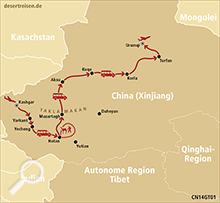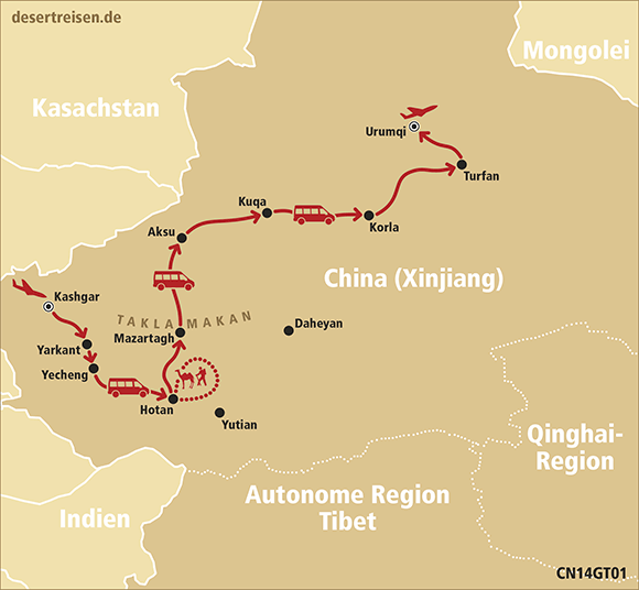 Flug von Frankfurt am Main nach Urumqi; kurzer Bummel durch die Hauptstadt der autonomen Region Xinjiang in Nordwesten Chinas; Inlandflug nach Kashgar; Besichtigung des Grabmahls Abakh Hoja, der Moschee Id Kah und der Altstadt; Weiterfahrt auf der Südroute der Seidenstraße über Yarkant und Yecheng zur Oasenstadt Hotan; Markbesichtigung: Teppiche, Jade, Seiden, Papier etc.; Fahrt in die Wüste Taklamakan; Treffen mit Lastkamelen und den uigurischen Kameltreibern; 3-tägige Wüstenwanderung zu Fuß in Begleitung von Lastkamelen mit Reitmöglichkeit; Tage in einer grandiosen Dünenlandschaft mit phantastischem Farbenspiel bei wechselnden Lichtstimmungen; Ende der Wüstenwanderung in der Nähe des Dorfes Hanggui und Fahrt nach Kothan; über Aksu nach Karayulgun; über Baicheng durch die Tian Shan-Berge nach Kuqa; Besuch der Buddha-Grotten von Kizil mit schönen Wandmalereien; Fahrt entlang der Tian Shan-Berge nach Korla; über en 1800 Meter hohen Pass Argaybulak Daban nach Turfan; Besichtigung der Ruinenstadt Gaochang und der Beziklik Buddha Höhle sowie der Emin-Moschee; in Urumqi endet die Reise; Rückflug von Urumqi nach Frankfurt am Main.
