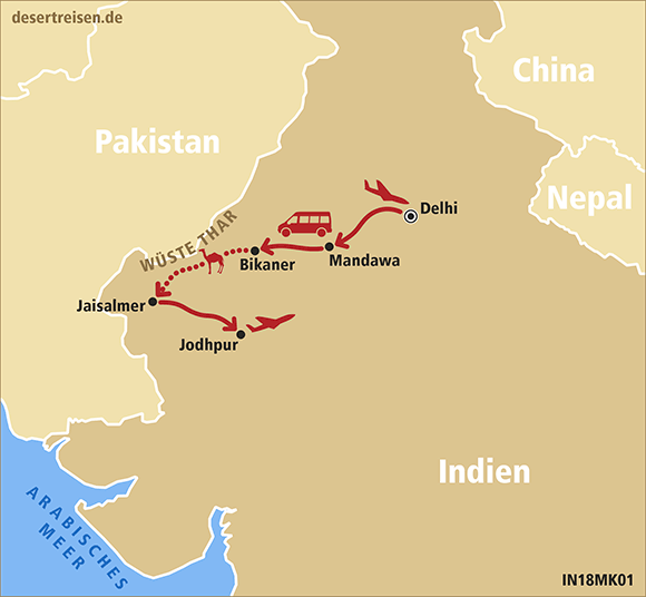 Flug von Frankfurt am Main nach Delhi; Fahrt über die kleine Stadt Mandawa zur Stadt Bikaner in Rajasthan; Treffen mit den Kamelen und ihren Besitzern in der Wüste Thar; 9-tägiges Kameltrekking durch diese überwiegend aus Sand bestehende Wüste – es besteht die Möglichkeit zu reiten oder zu wandern; vorbei an kleinen Dörfern; erholsame Tage in der Wüste; stille Nächte unter dem Sternenhimmel; nach unvergesslichen Tagen in der Thar-Wüste am Ende des Wüstenerlebnisses Fahrt über Jaisalmer nach Jodhpur; Flug von Jodhpur nach Delhi; Rückflug von Delhi nach Frankfurt am Main.