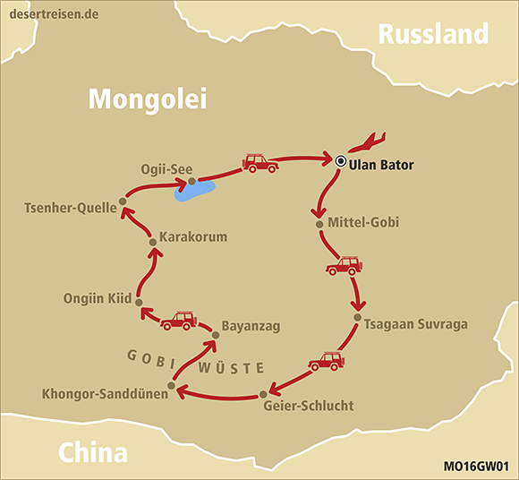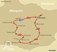 Flug von Frankfurt am Main nach Ulan Bator; kurzer Bummel durch die Hauptstadt der Mongolei; Fahrt in die Wüste Gobi; über die Geierschlucht im Gurvan Saikhan ("Die drei Schönen")-Nationalpark in einer Berglandschaft zu den singenden Dünen von Khongor; unvergessliches Sanderlebnis in bis zu 300 Metern hohen Dünen, Sand soweit das Auge reicht; zum Dinosaurier-Friedhof in der Erosionslandschaft Bayanzag; Begegnung mit nomadischen Mongolen und Kamelzüchtern; Weiterfahrt nach Norden und Besuch eines Tempelmuseums in der Nähe von Ongin Kiid; über die ehemalige Hauptstadt der Mongolei Karakorum und die buddhistische Klosteranlage Erdene-Zuu zu den heißen Quellen in Tsenher; Weiterfahrt zum idyllisch gelegenen Ogii-See in der Arkhangai Provinz; Beobachtung von verschiedenen Vogelarten am Ufer des Sees; Rückfahrt nach Ulan Bator; Tagesausflug zum Terelj Nationalpark; Rückflug von Ulan Bator nach Frankfurt am Main.