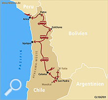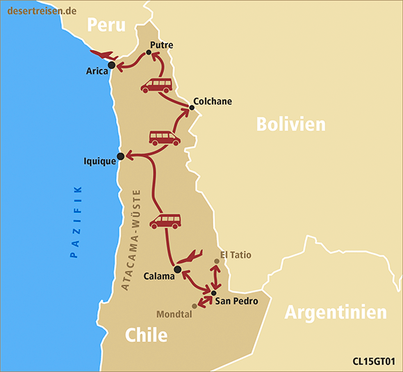 Flug von Frankfurt am Main nach Santiago de Chile; Rundgang durch die Hauptstadt Chiles; kleine Wanderung im Nationalpark La Campana mit schönem Kaktusbestand und vielen Chilepalmen; Besuch der geschichtsreichen Hafenstadt Valparaiso; Inlandsflug von Santiago de Chile nach Calama im Norden Chiles; Transfer nach San Pedro und Besichtigung dieser Oase; Erkundung der Ruinenanlage von Pukara de Quitor mit schöner Aussicht über die ganze Oase; Ausflug in das Mondtal; Tagestour zur Laguna Miscanti und zur Salzpfanne von San Pedro; Fahrt hoch zum geothermischen Feld El Tatio; Besuch der heißen Quellen von Puritama; Fahrt auf der Panamericana zur Küstenstadt Iquique; Besuch der Geisterstadt Humberstone; Fahrt an die bolivianische Grenze bei Colchane; kleine Wanderung an der Salzpfanne von Caipasa; Fahrt auf einer Schotterstraße entlang der Anden nach Putre; Besuch der Salzpfanne von Surire inmitten einer Vielzahl von teilweise aktiven Vulkanen; Ausflug zur Laguna Chungara auf 4600 Meter am Fuße des vergletscherten Vulkanriesen Parinacota; Transfer nach Arica an der pazifischen Küste; Spaziergang am Pazifik; Erholung im Hotel in Arica; Rückflug über Santiago de Chile nach Frankfurt am Main.